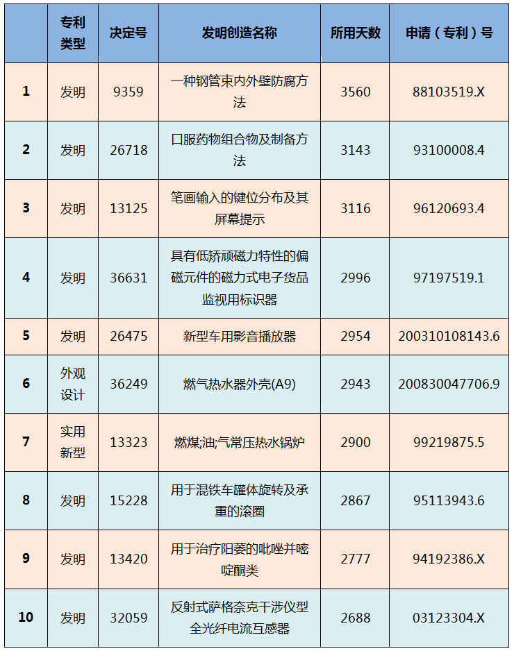 另外,上述总体平均用时与一般经验相比明显过长。对此,笔者统计了用时最长的决定,初步可以判断用时较长(例如超过1年)的案件均涉及一次或者多次行政诉讼,因此耗时较长。其中前10个耗时最长的决定列表如下,以供参考: