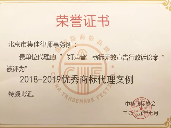 >88体育>关于我们>荣誉概览>2019>集佳代理“好声音”商标无效宣告行政案入选“优秀商标代理案例”