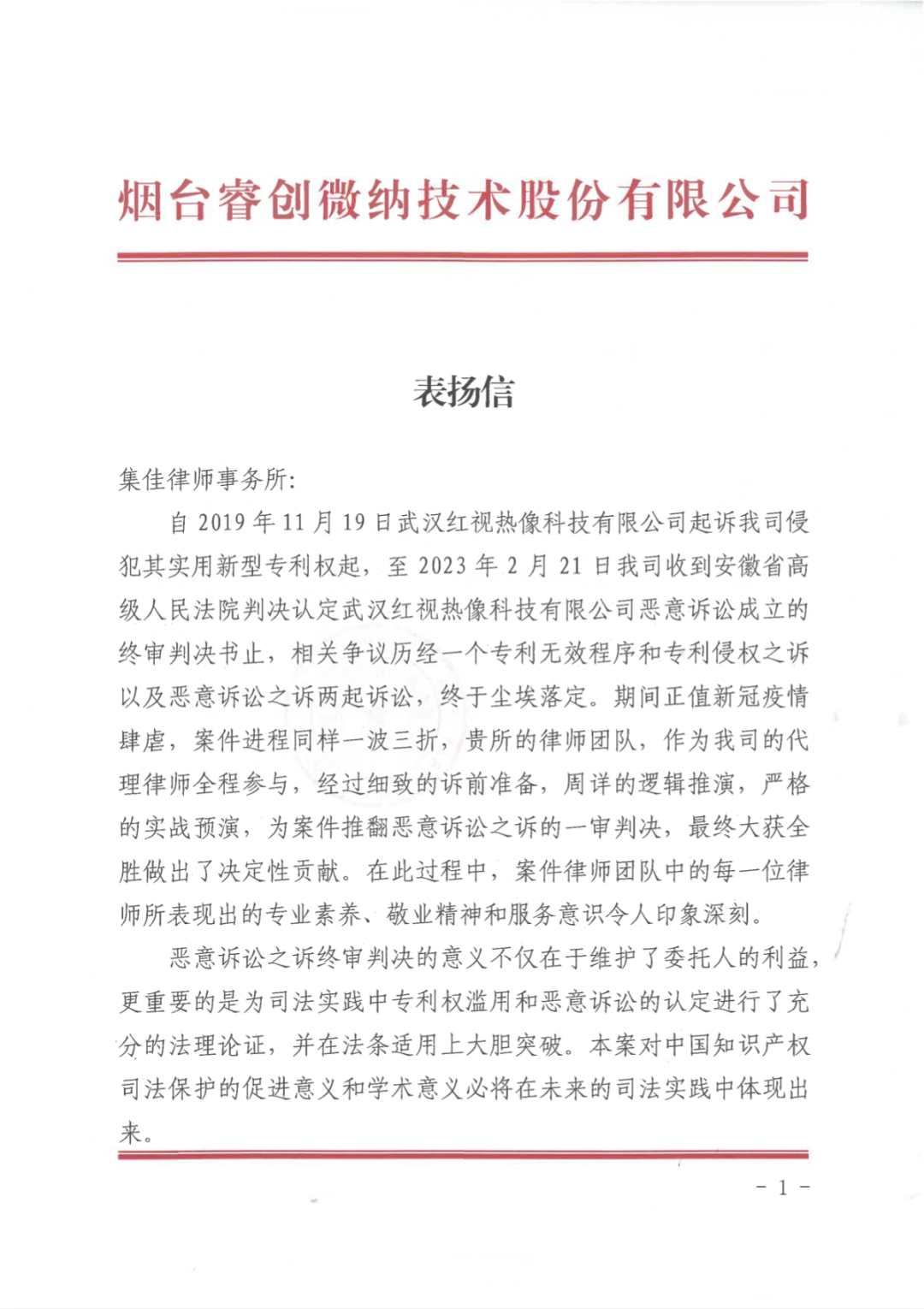 2023年2月10日,安徽省高级人民法院就烟台睿创微纳技术股份有限公司、烟台艾睿光电科技有限公司、安徽英睿系统技术有限公司等(下称“睿创集团”)与武汉红视热像科技有限公司(下称“武汉红视”)因恶意提起知识产权诉讼损害责任纠纷一案作出终审判决,认定武汉红视滥用诉权的行为构成恶意诉讼,并判令其赔偿睿创集团相应的合理支出。至此,时隔四年,横跨疫情时代的专利侵权及恶意诉讼系列纠纷案,终于尘埃落定。88体育协助睿创集团最终取得系列案件的全面胜利,维护了客户合法权益,实现了商业竞争的公平正义!