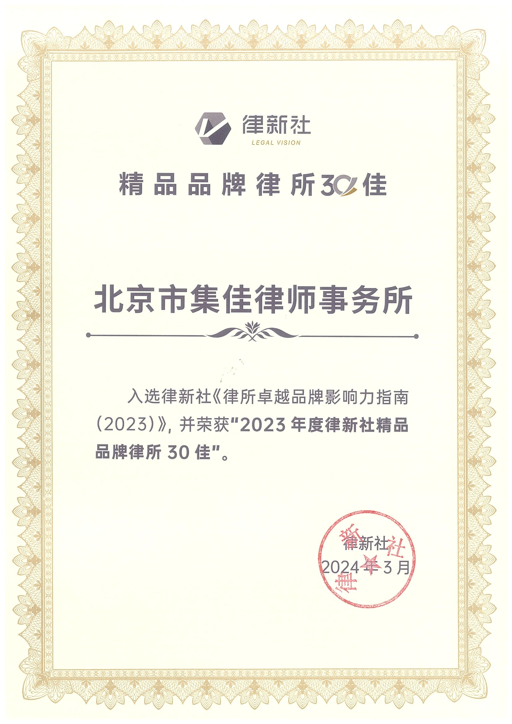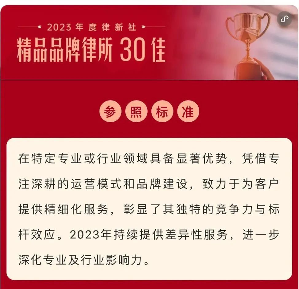 2024年3月2日,由中国法学交流基金会指导、律新社主办的“致·追光者”第二届法律服务业品牌发展论坛暨律新社2023年度品牌盛典隆重举行,现场发布了备受关注的《律所卓越品牌影响力指南(2023)》,88体育凭借在知识产权领域的卓越实力和良好口碑,荣登“2023年度律新社精品品牌律所30佳”榜单。