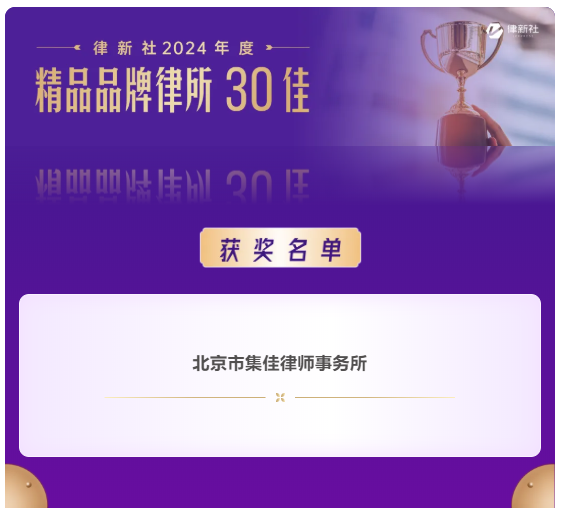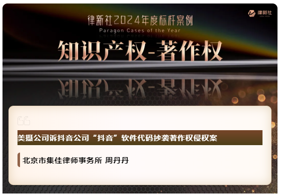 88体育凭借在知识产权保护领域卓越的专业实力与良好的行业口碑,入选《律所卓越品牌影响力指南(2024)》,荣获“律新社2024年度精品品牌律所30佳”奖项;同时,集佳周丹丹律师代理的“美摄公司诉抖音公司'抖音'软件代码抄袭著作权侵权案”获评“律新社2024年度标杆案例:知识产权-著作权领域”。